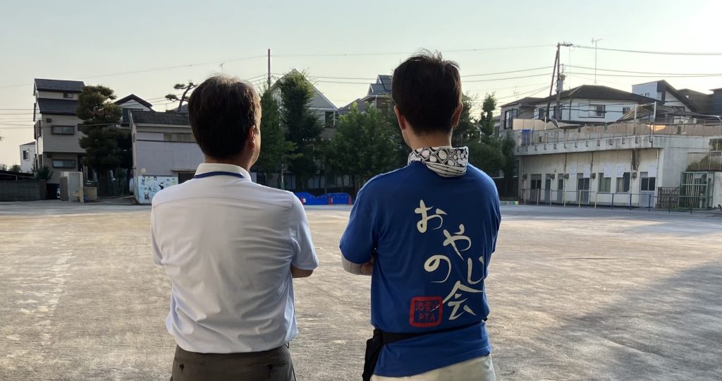 校長先生が晴れやかな表情でお祭り後の綺麗に片付いた校庭を眺めていらっしゃいました。おやじの会元会長もいらしたので昨年に続き今年も後ろから写真を撮らせて頂きました。
